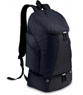 Sports backpack in 600D polyester and Ripstop 300D. Large main compartment and bottom shoe compartment with eyelets. Side pockets, padded breathable back and adjustable shoulder straps. Capacity : 30 L - Dimensions :...