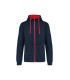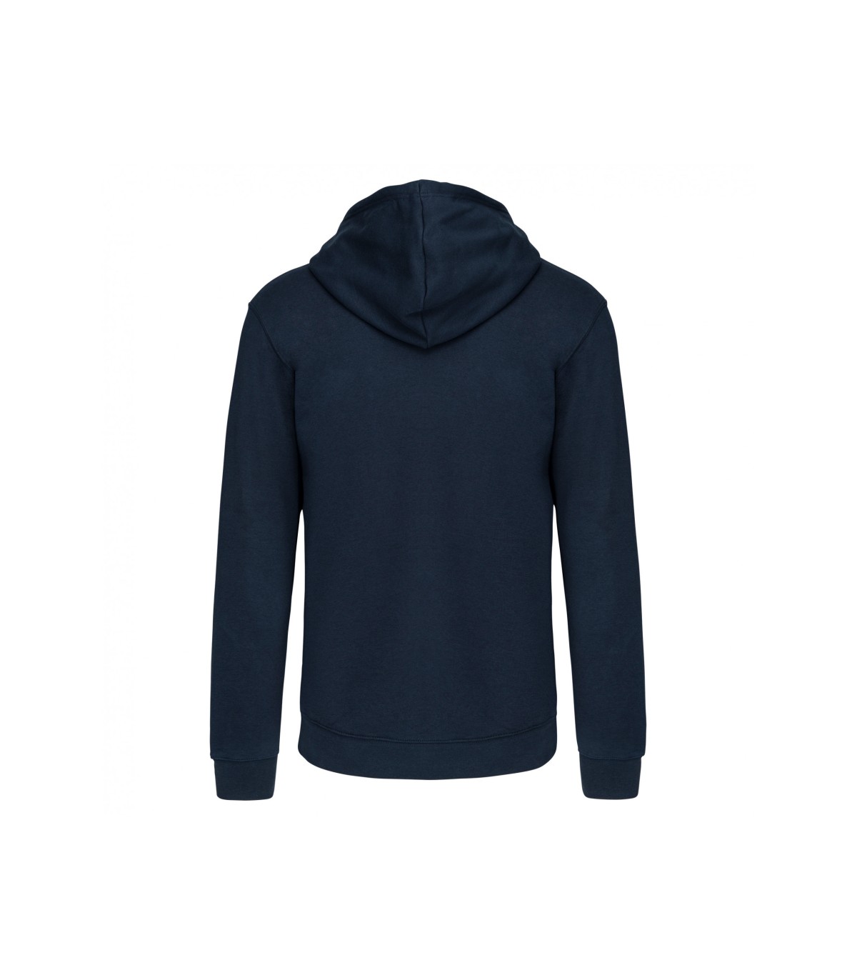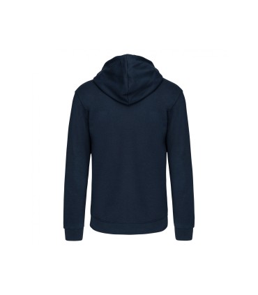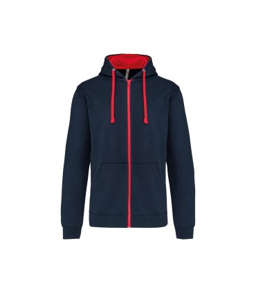 280gr/m².- 80% combed cotton/20% polyester (Oxford Grey : 76% combed cotton / 21% polyester / 3% viscose). Brushed fleece. Kangaroo pocket with earphone access. Ribbed cuffs and hem. Lined, contrasting hood with drawstring. Contrast zip fastening.