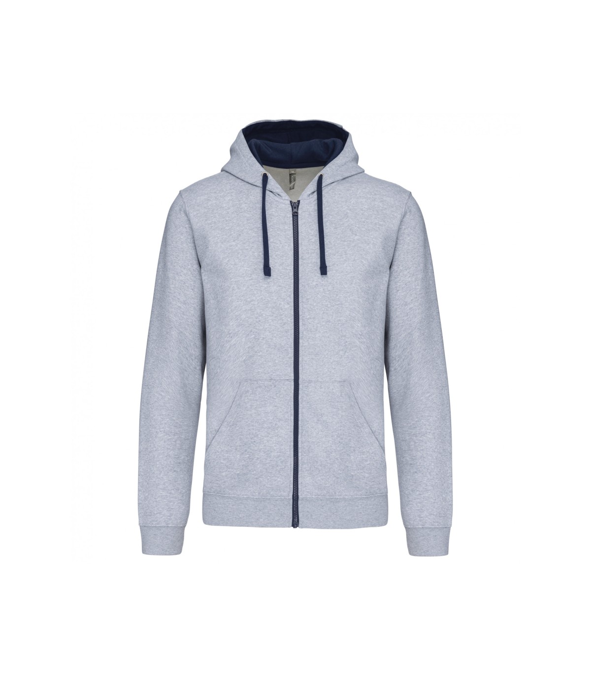 280gr/m².- 80% combed cotton/20% polyester (Oxford Grey : 76% combed cotton / 21% polyester / 3% viscose). Brushed fleece. Kangaroo pocket with earphone access. Ribbed cuffs and hem. Lined, contrasting hood with drawstring. Contrast zip fastening.