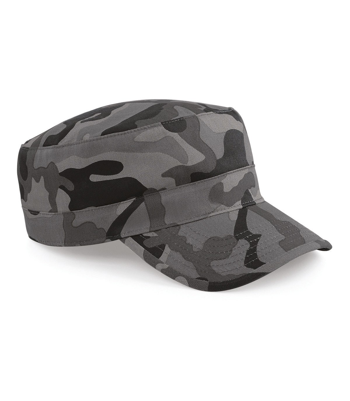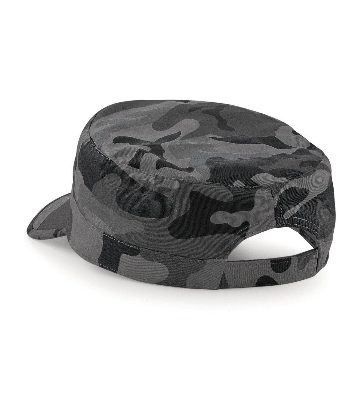 190g/m². 100% coton twill. Style militaire avec motif camouflage. Quadruple surpiqûre sur la visière préformée, courte et arrondie. Œillets surpiqués. Fermeture arrière réglable par boucle métallique.