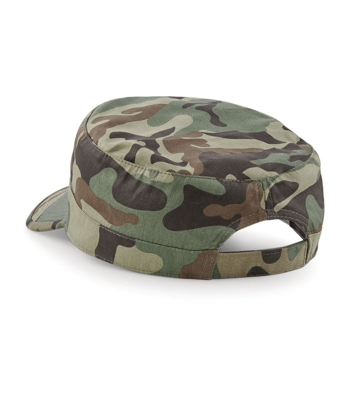 190g/m². 100% coton twill. Style militaire avec motif camouflage. Quadruple surpiqûre sur la visière préformée, courte et arrondie. Œillets surpiqués. Fermeture arrière réglable par boucle métallique.