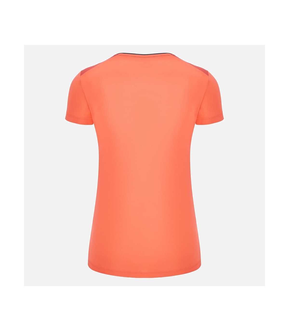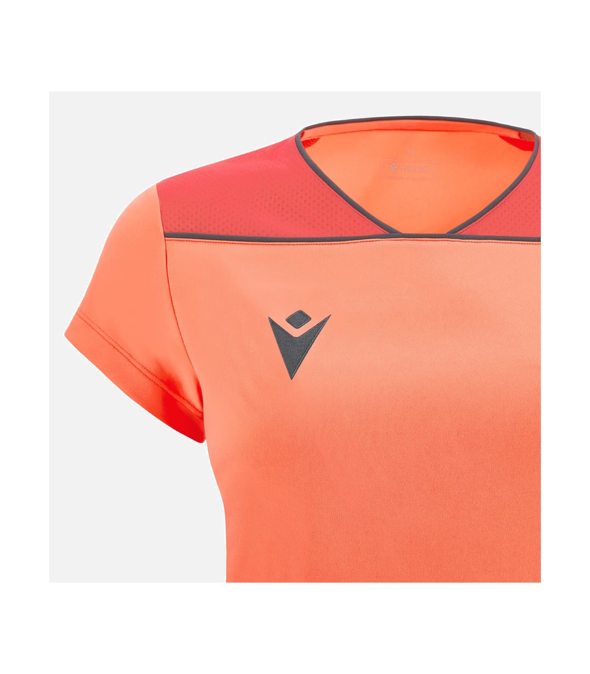 T-shirt de compétition femme en tissu Softlock avec un col en V souligné par une bordure contrastée également utilisée sur l'empiècement avant. Avec des inserts légers en Micromesh sur les côtés et les épaules pour améliorer la respirabilité.
