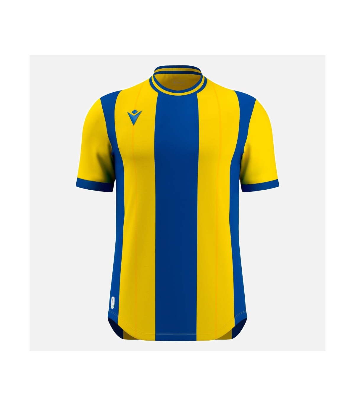 Maillot de match à cinq bandes verticales entièrement réalisé en tissu Eco-Fabric, 100 % issu de PET recyclé. Le col rond est en tricot. Dans le dos, les bandes sont interrompues pour permettre l'impression des noms et des numéros et garantir leur bonne visibilité. Le devant comporte le logo Macron Hero en silicone et le dos est en Eco micromesh pour permettre une respirabilité maximale. Disponible en 8 coloris.