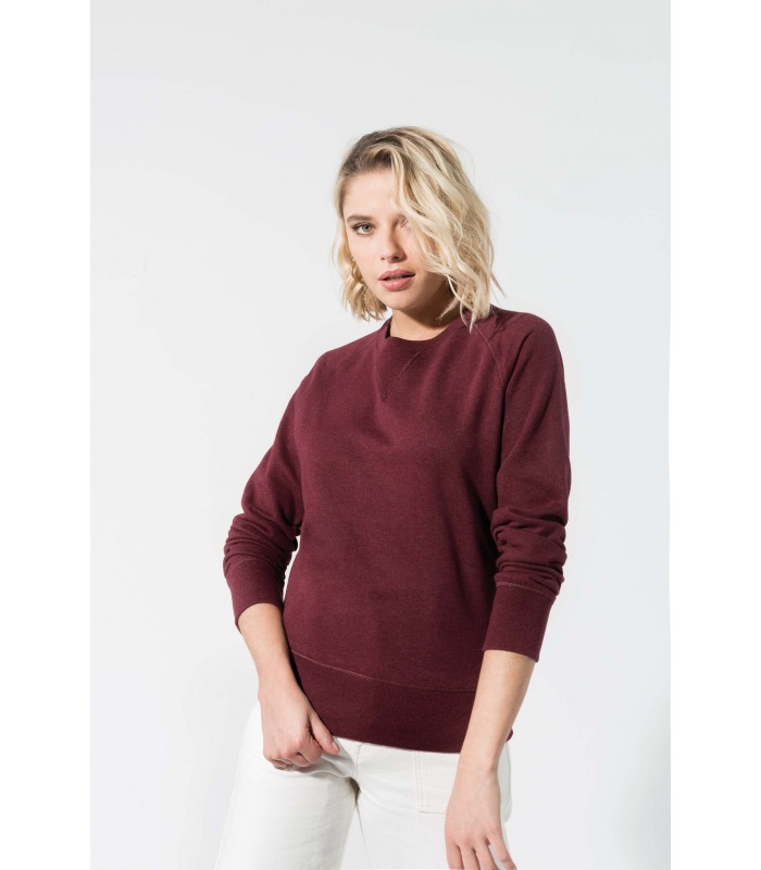 80% coton / 20% polyester. Le sweat-shirt est conçu à partir de 80% de coton biologique. Le certificat OCS blended (Organic Content Standard) est délivré par Ecocert Greenlife. Molleton non gratté (French Terry). Molleton non gratté (French Terry). LST (Low Shrinkage Terry). Coupe mode. Bord-côte col, bas de manches et de vêtement. Bande de propreté chevron intérieur col et application en V à l'encolure.