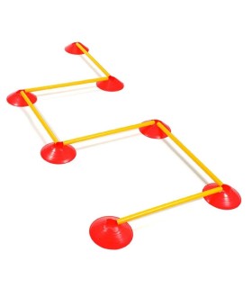 Trainingspakket met: 5 voeten + 5 stokken (1m50 in 3 stuks) 1 loopladder + tas1 parachute + tas1 pomp6 haagjes (2 x 15cm + 2 x 23cm + 2 x 30cm) 10 kleine kegels 23cm50 Markeerschijven1 tas voor al dit materiaal
