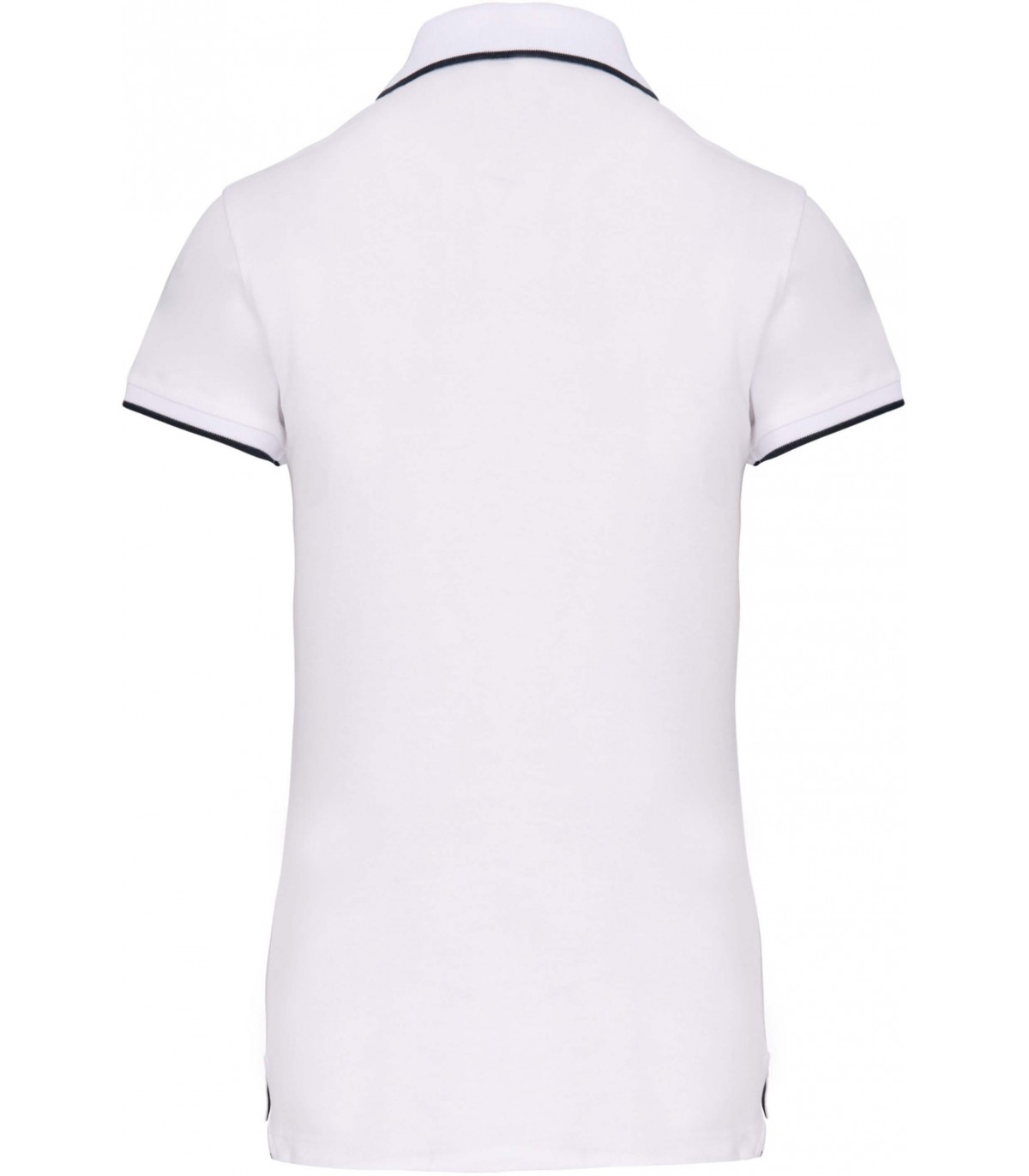 100% katoen piqué. Kraag in rib met bies in contrastkleur aan de bovenkant. Nektape en zijsplitjes in contrastkleur. Fantasie knooplijst met 5 knopen. Mouwuiteinden in rib met bies in contrastkleur. Afwerking met dubbele stiksels aan de onderkant. De kraag is verstevigd aan de achterkant en kan omhoog of omlaag gedragen worden.