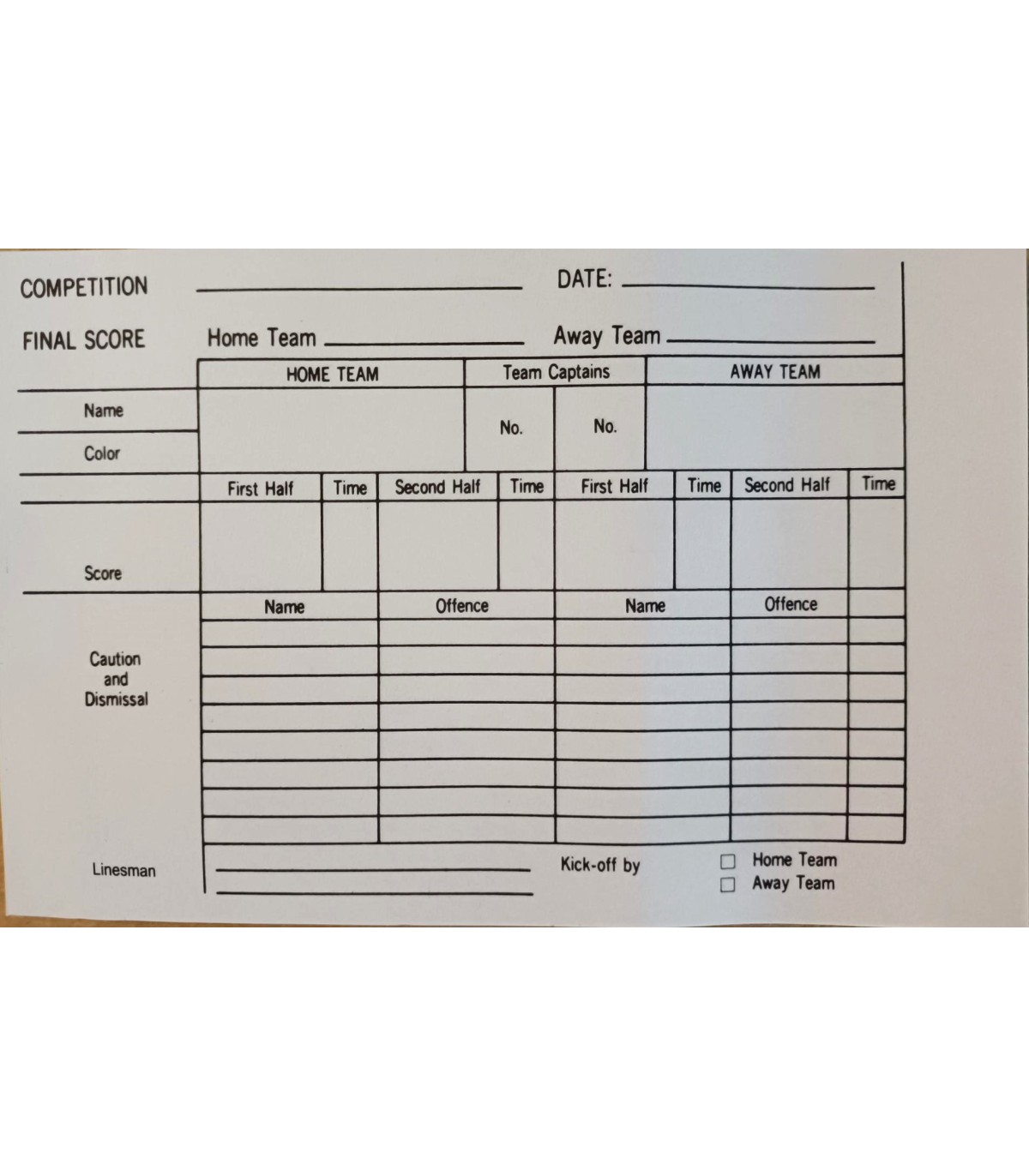 Notitieblok voor scheidsrechter met informatie over de teams en de wedstrijd. Aantal 25 vellen papier. Afmeting 15x10cm.