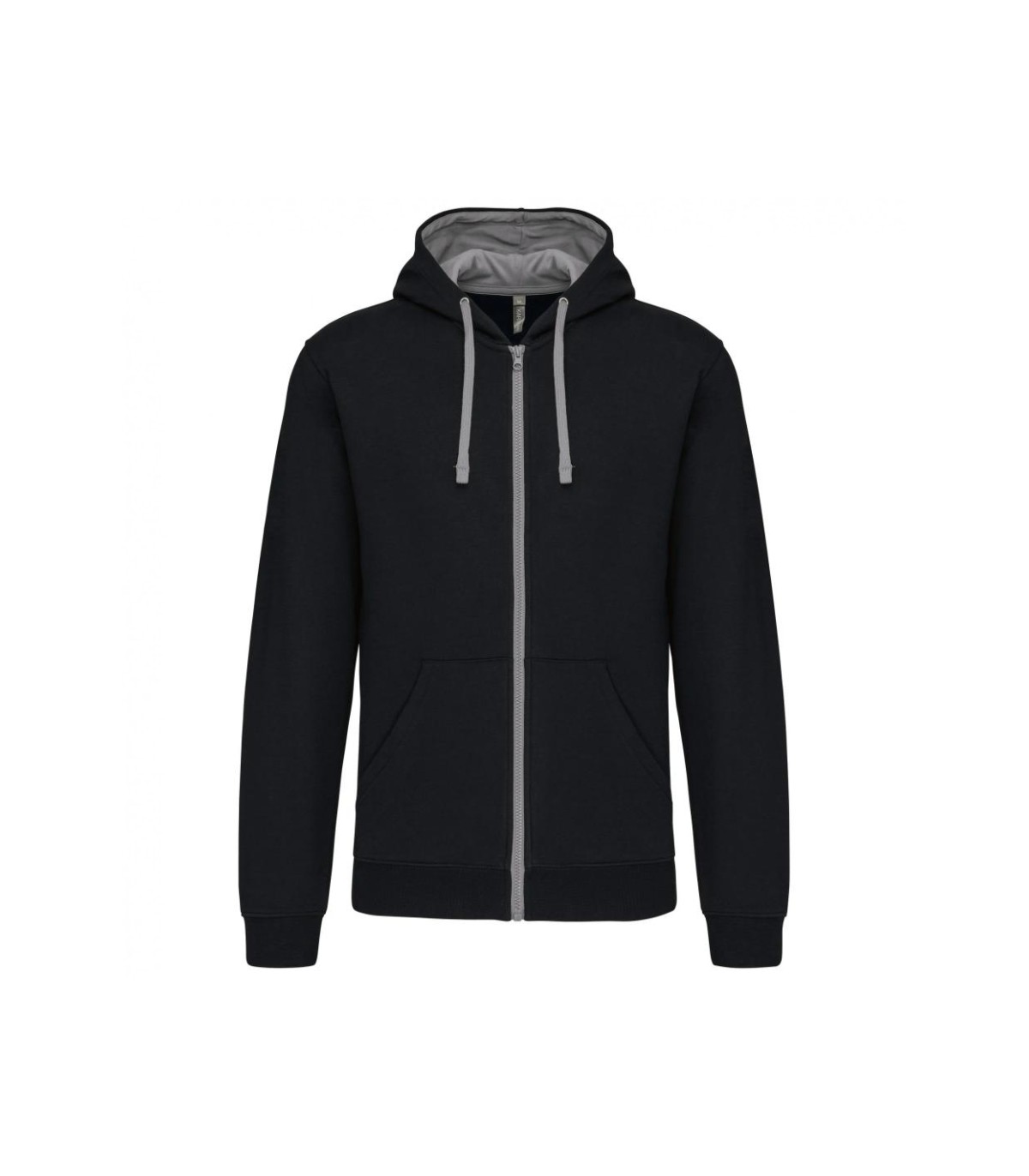 280gr/m². - 80% katoen / 20% polyester (Oxford Grey: 76% gekamd katoen / 21% polyester / 3% viscose). Geborsteld fleece aan de binnenkant. Gaatje voor draadje in de kangoeroezak en lusje aan de kraag voor oortjes. Ribboord aan mouwuiteinden en onderkant kledingstuk. Gevoerde capuchon in contrasterende kleur met aanrijgkoordjes. Rits in contrasterende kleur.