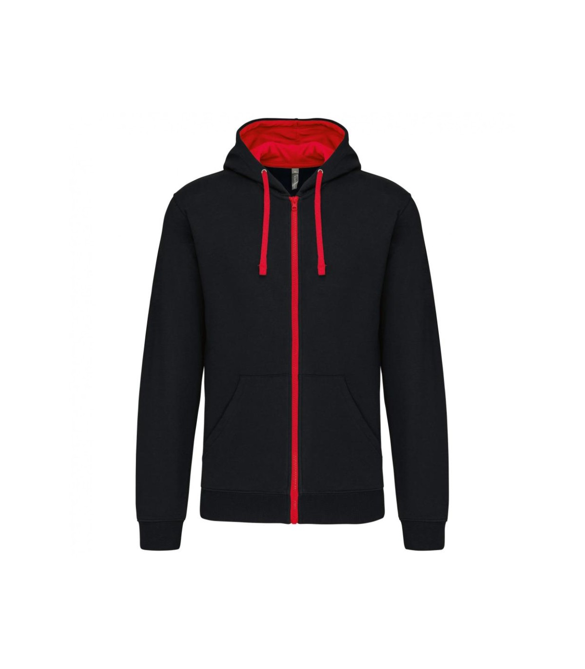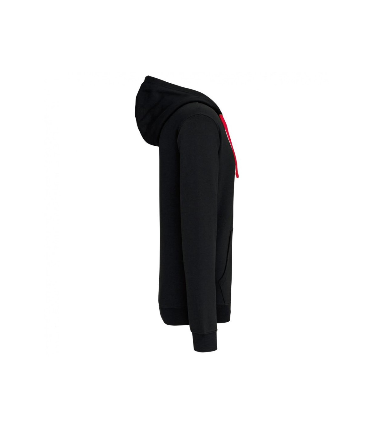 280gr/m². - 80% katoen / 20% polyester (Oxford Grey: 76% gekamd katoen / 21% polyester / 3% viscose). Geborsteld fleece aan de binnenkant. Gaatje voor draadje in de kangoeroezak en lusje aan de kraag voor oortjes. Ribboord aan mouwuiteinden en onderkant kledingstuk. Gevoerde capuchon in contrasterende kleur met aanrijgkoordjes. Rits in contrasterende kleur.