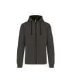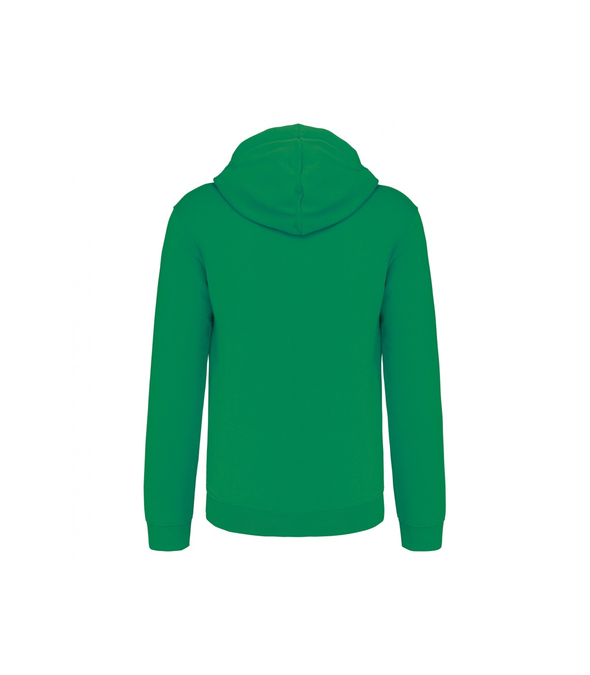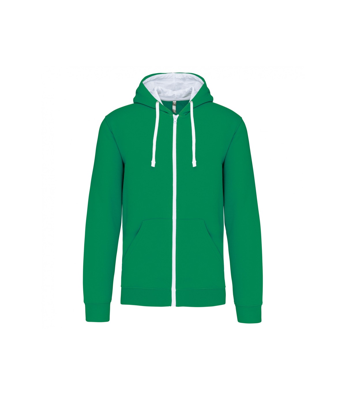 280gr/m². - 80% katoen / 20% polyester (Oxford Grey: 76% gekamd katoen / 21% polyester / 3% viscose). Geborsteld fleece aan de binnenkant. Gaatje voor draadje in de kangoeroezak en lusje aan de kraag voor oortjes. Ribboord aan mouwuiteinden en onderkant kledingstuk. Gevoerde capuchon in contrasterende kleur met aanrijgkoordjes. Rits in contrasterende kleur.