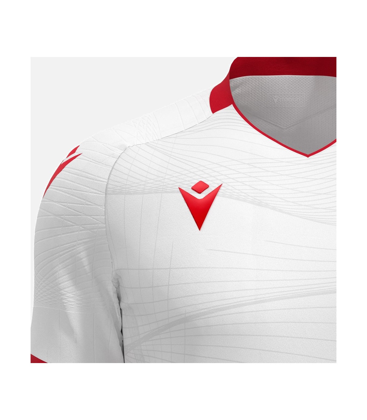 Wedstrijdshirt volledig gemaakt van Eco-Fabric, verkregen uit 100% gerecycled PET. De gebreide V-hals heeft een bies aan de voorzijde. Het shirt heeft een opvallende optische textuur in reliëf op de mouwen en een dye-sub-print op de voorkant. Het Macron Hero-logo staat in siliconen op de voorkant. De achterkant van Eco-micromesh garandeert een uitstekend ademend vermogen. Verkrijgbaar in 14 kleurenversies.