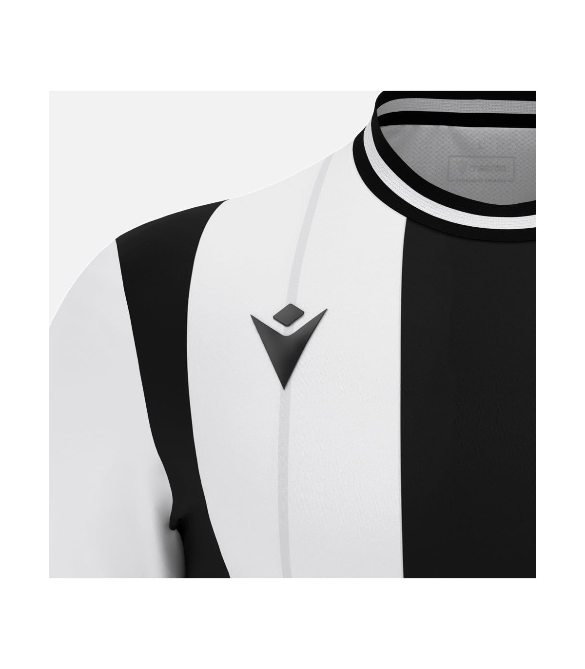 Match jersey met vijf verticale strepen volledig gemaakt van Eco-Fabric-stof, 100% van gerecycled PET. De ronde hals is gebreid. Aan de achterkant zijn de banden onderbroken om het afdrukken van namen en nummers mogelijk te maken en een goede zichtbaarheid te garanderen. De voorkant is voorzien van het Macron Hero-logo in siliconen en de achterkant is van Eco-micromesh voor maximaal ademend vermogen. Verkrijgbaar in 8 kleuren..
