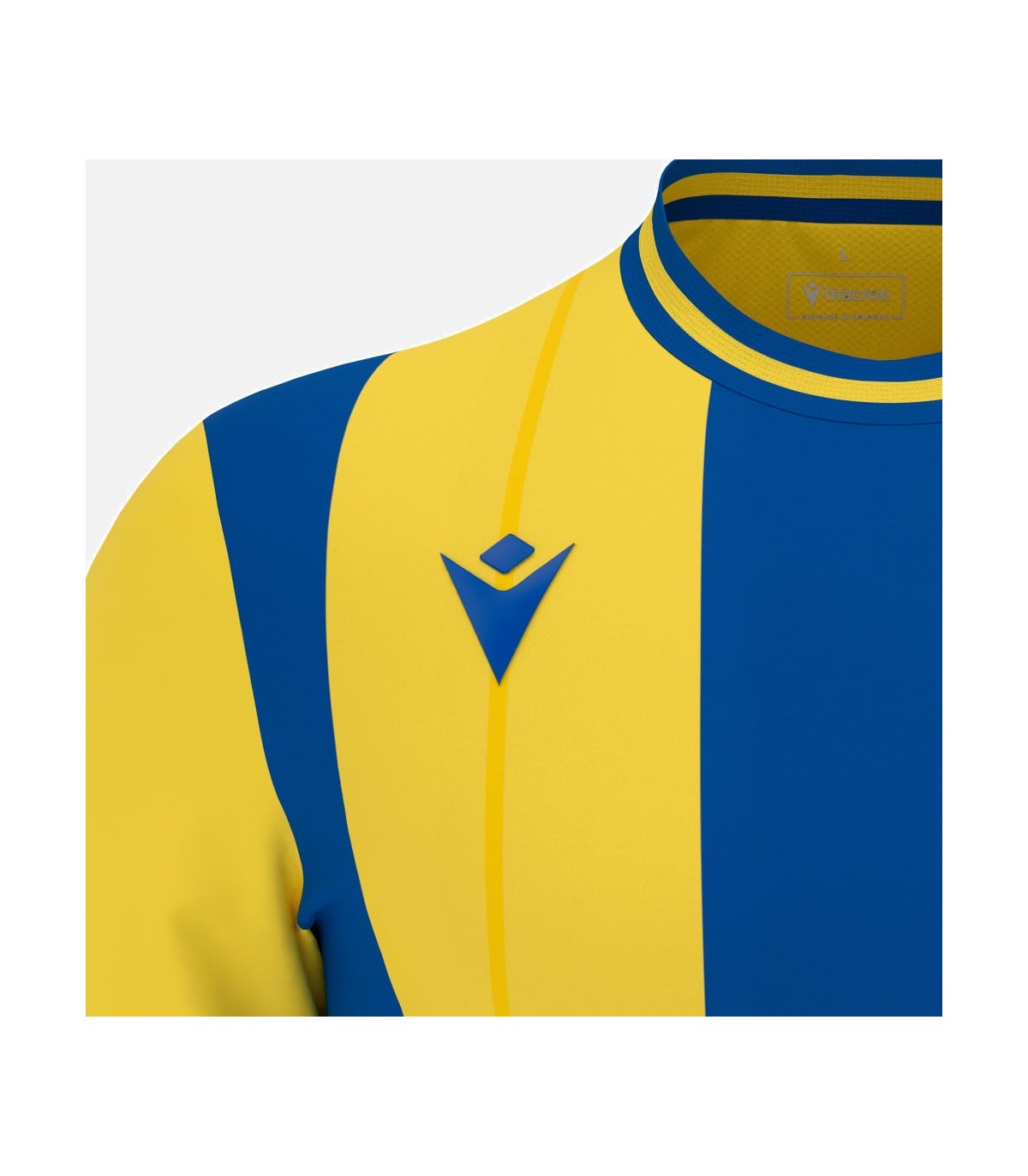 Match jersey met vijf verticale strepen volledig gemaakt van Eco-Fabric-stof, 100% van gerecycled PET. De ronde hals is gebreid. Aan de achterkant zijn de banden onderbroken om het afdrukken van namen en nummers mogelijk te maken en een goede zichtbaarheid te garanderen. De voorkant is voorzien van het Macron Hero-logo in siliconen en de achterkant is van Eco-micromesh voor maximaal ademend vermogen. Verkrijgbaar in 8 kleuren.